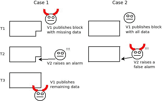 Imagine a full node , raises an alarm: "I'm missing chunk 42!". The malicious producer can immediately broadcast chunk 42. Another full node, , might receive chunk 42 first, and then see 's alarm. From 's perspective, is the liar launching a DoS attack. There is no way for the network to reliably agree on who was malicious. This makes any reward or slashing system based on alarms impossible to implement.